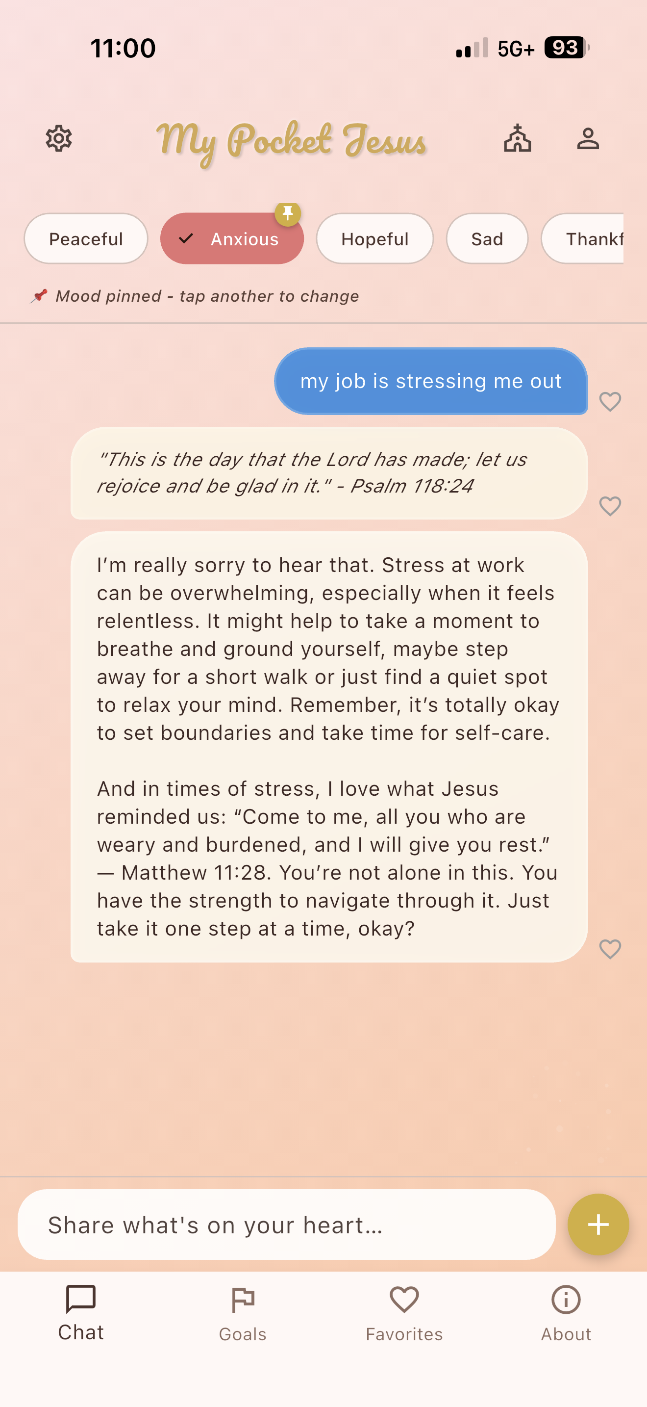 The app responds in real time with gentle, Scripture-rooted encouragement inspired by the teachings of Jesus in the New Testament.